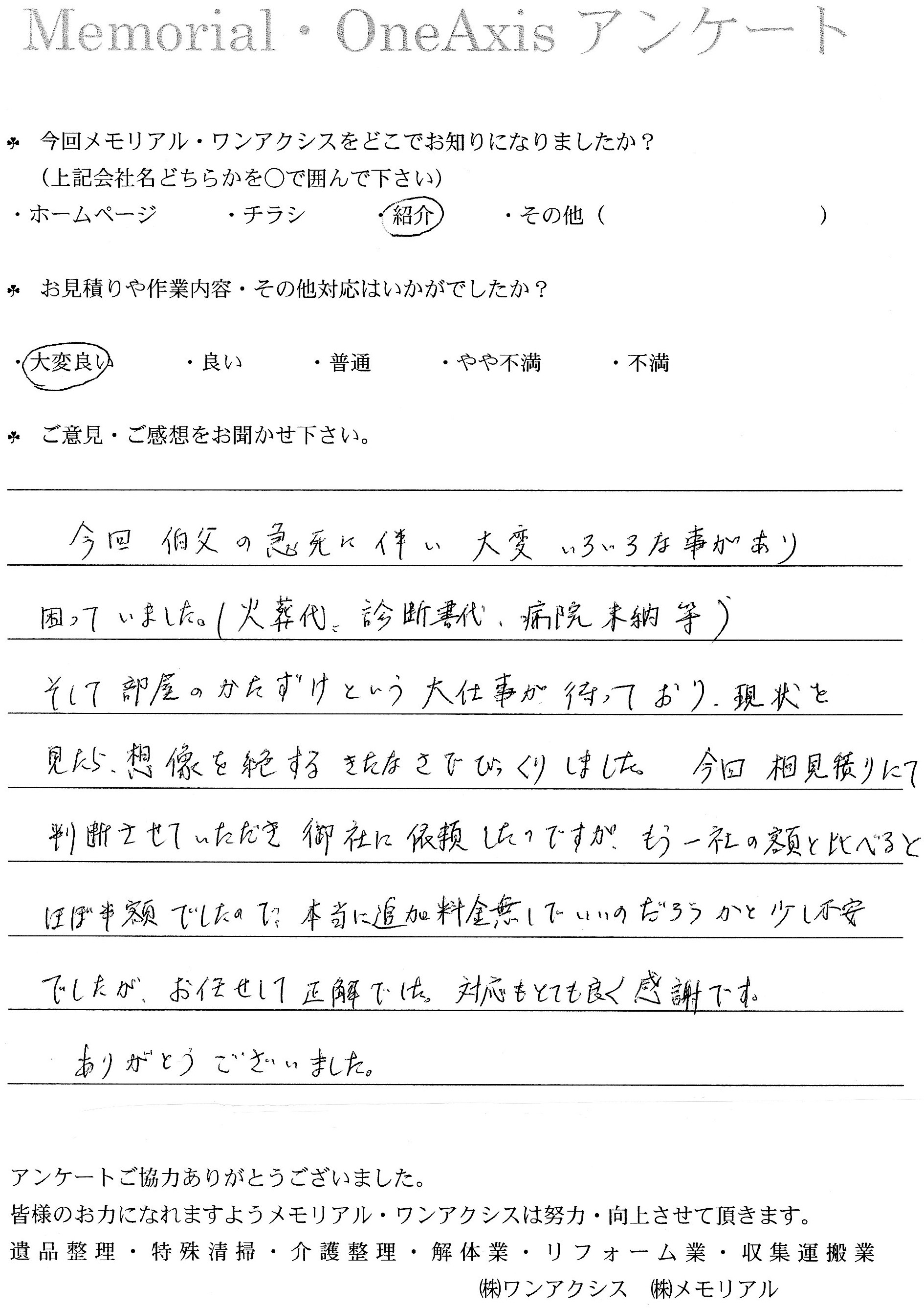 先日作業させていただいたお客様からアンケートをご返信いただきました。ご感想とても嬉しく思います。