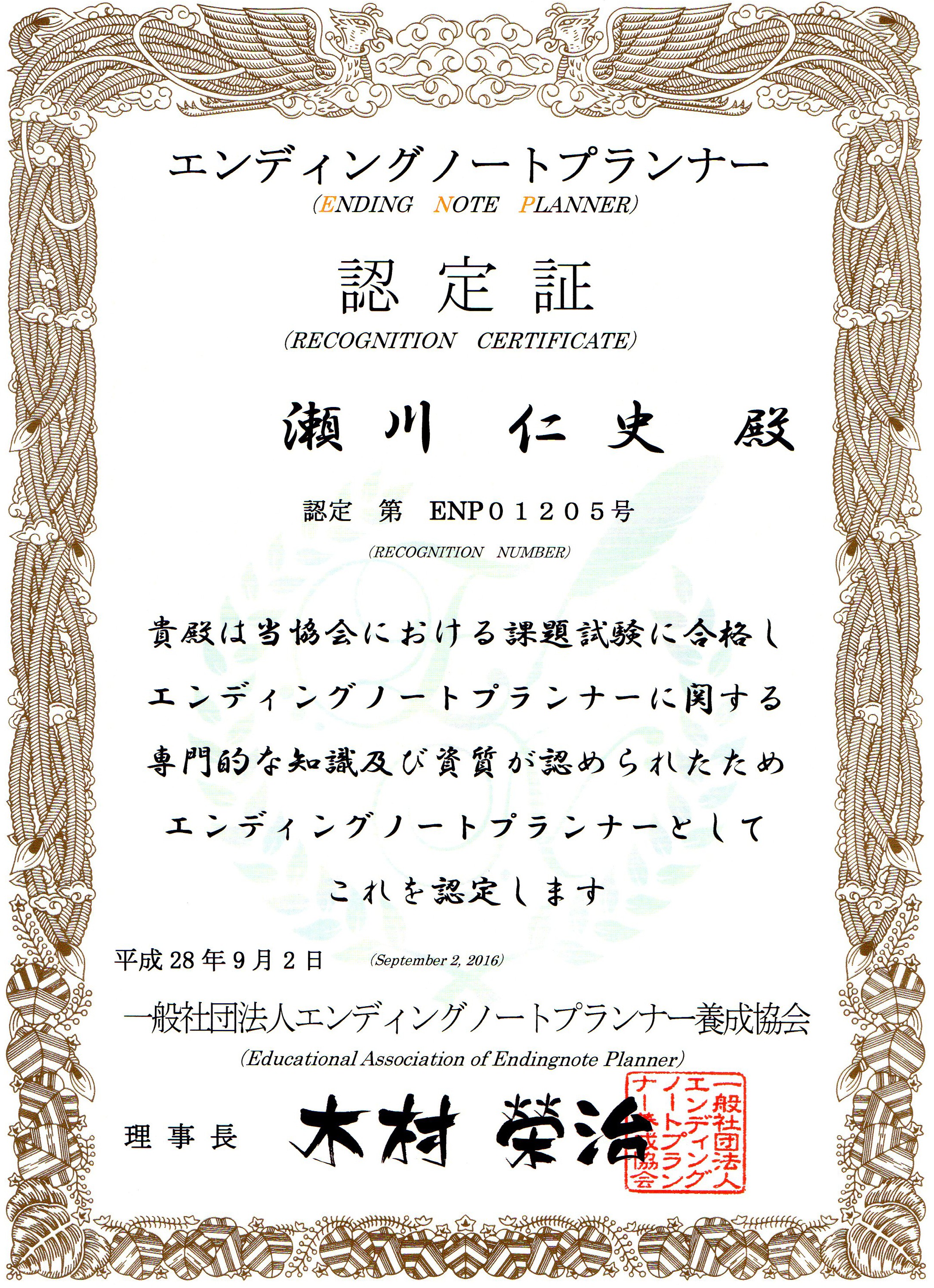 この度、一般社団法人エンディングノートプランナー養成協会が行っている「エンディングノートプランナー」の資格を取得し、広報アドバイザー会員に就任いたしました。