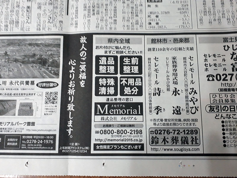 本日、4月11日水曜日付けの上毛新聞19面のお悔やみ欄下の、仏壇・仏具特集に『メモリアル』の広告を掲載いたしました。