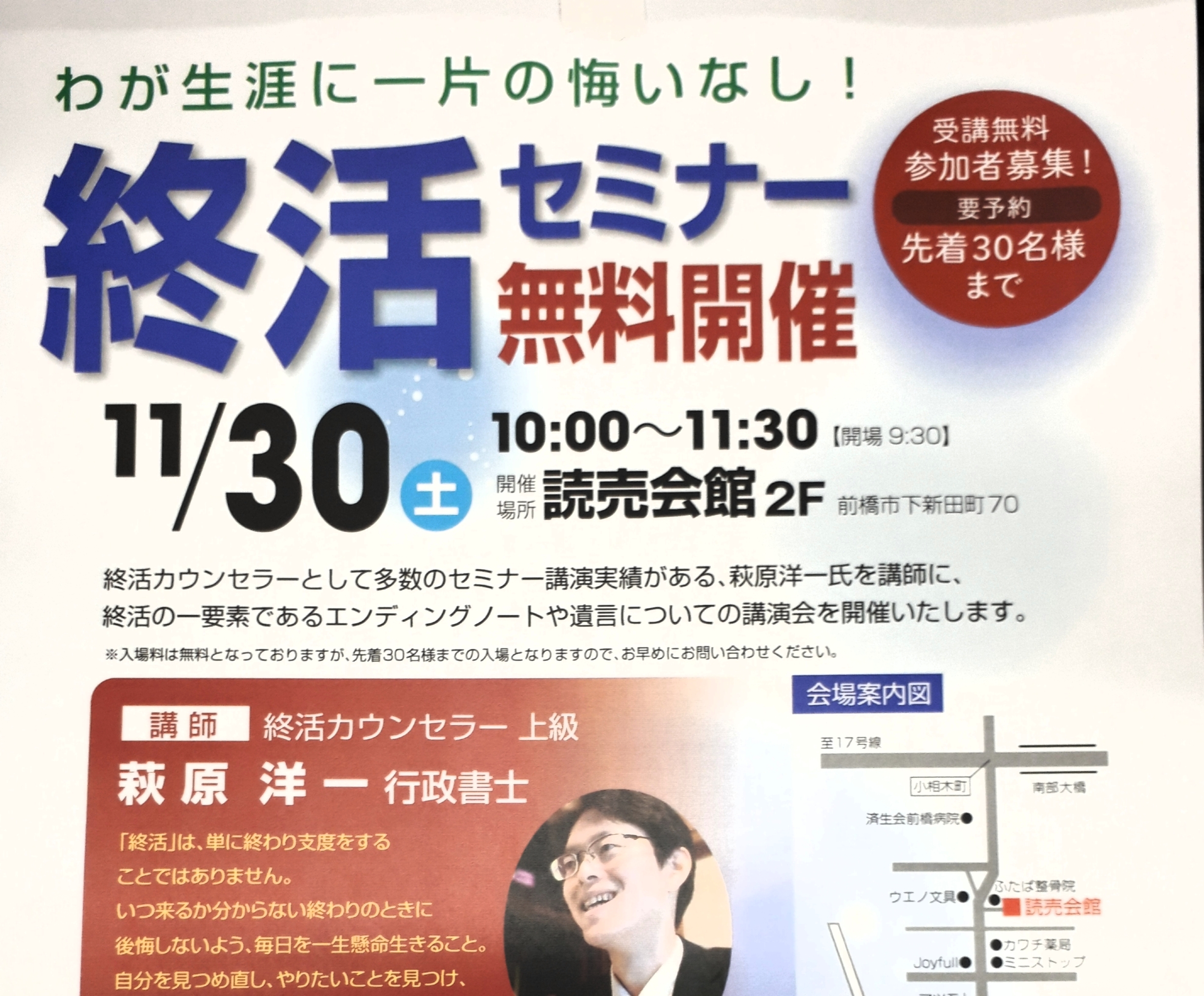 来る、11月30日(土)10時より、前橋市下新田町にあります読売会館にて『終活セミナー』が開催されます。